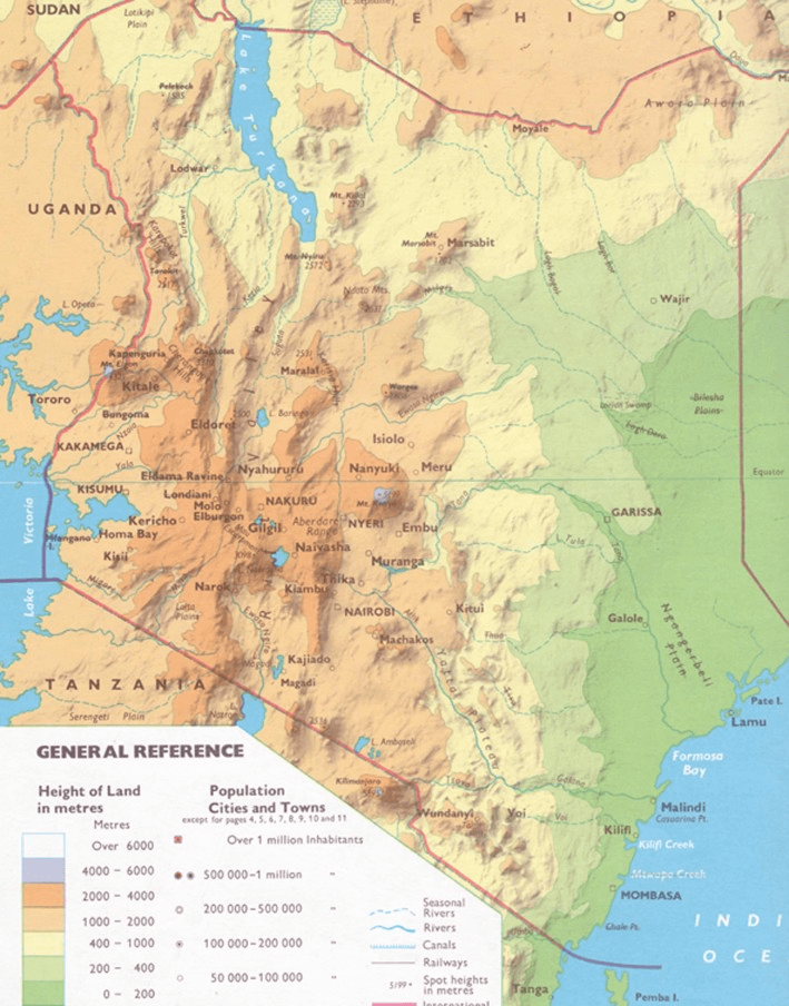 Dem flachen, eintönigen Küstenstreifen und seinem Hinterland steht das Hochland mit dem nordsüdlich verlaufenden Ostafrikanischen Graben, dem Rift-Valley, gegenüber. Im Westen grenzt Kenia an den Victoriasee. Dornsavannengebiete und Halbwüsten im Norden und Nordosten nehmen mehr als die Hälfte der Landesfläche ein. Das kühle Hochland erhält mit Ausnahme der trockenen Grabenzone reichlich Niederschläge und ist mit seinen fruchbaren, vulkanischen Verwitterungsböden das Hauptsiedlungsgebiet.
